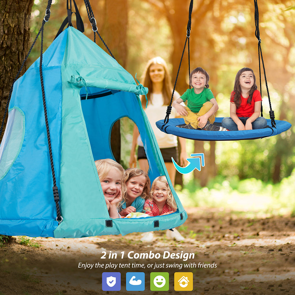Die 2-in-1-Nestschaukel mit Spielzelt bietet einen geschlossenen privaten Bereich für Kinder, in dem sie lesen, entspannen, schlafen und mit der Familie zusammen sein können. Es ist geräumig genug, um einzusteigen und mit Freunden zu hüpfen, zu schwingen oder Spieltermine zu genießen! Kinder können aus jedem Winkel aus den runden Fenstern schauen, während Eltern beobachten können, was los ist. Schwingen kann Kindern helfen, das Gleichgewicht zu halten und ihre Fantasie anzuregen.